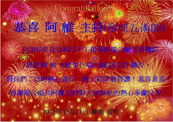 公告< 2 >~~~ 本廟主持 / 副主持 / 職位 与 2012年 12 / 10日 下午已經改選 ~~~ ~~~ 現任主持 由 原副主持 *** 改選為現任主持 ~ 現任副主持 由 原 本廟廟公 阿裕 改為 現任 副主持