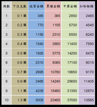 如:18開出下一期開始坐0.1車到第5期等於坐到0.5車有錢可坐多以點